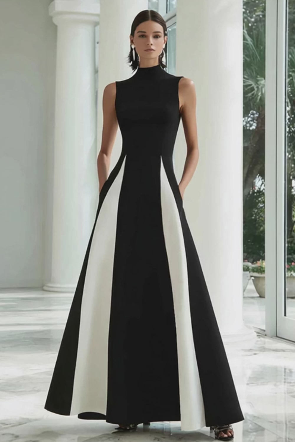 This elegant black-and-white A-line gown features a refined high neck and flowing long silhouette. A timeless choice for galas, formal evenings, and sophisticated winter events.