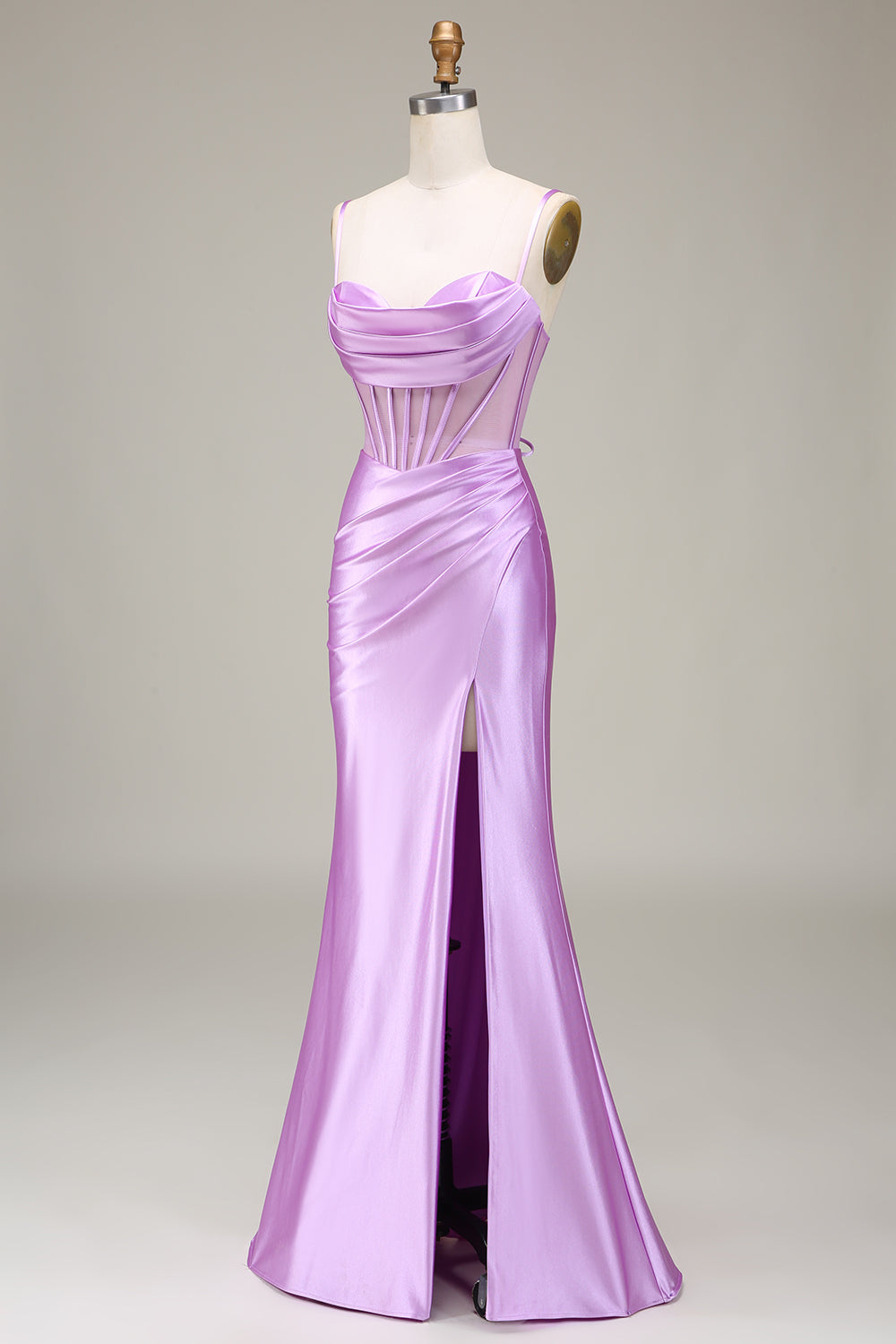 Mermaid Satin Spaghetti Straps Lilac Corset Prom Dress with Slit