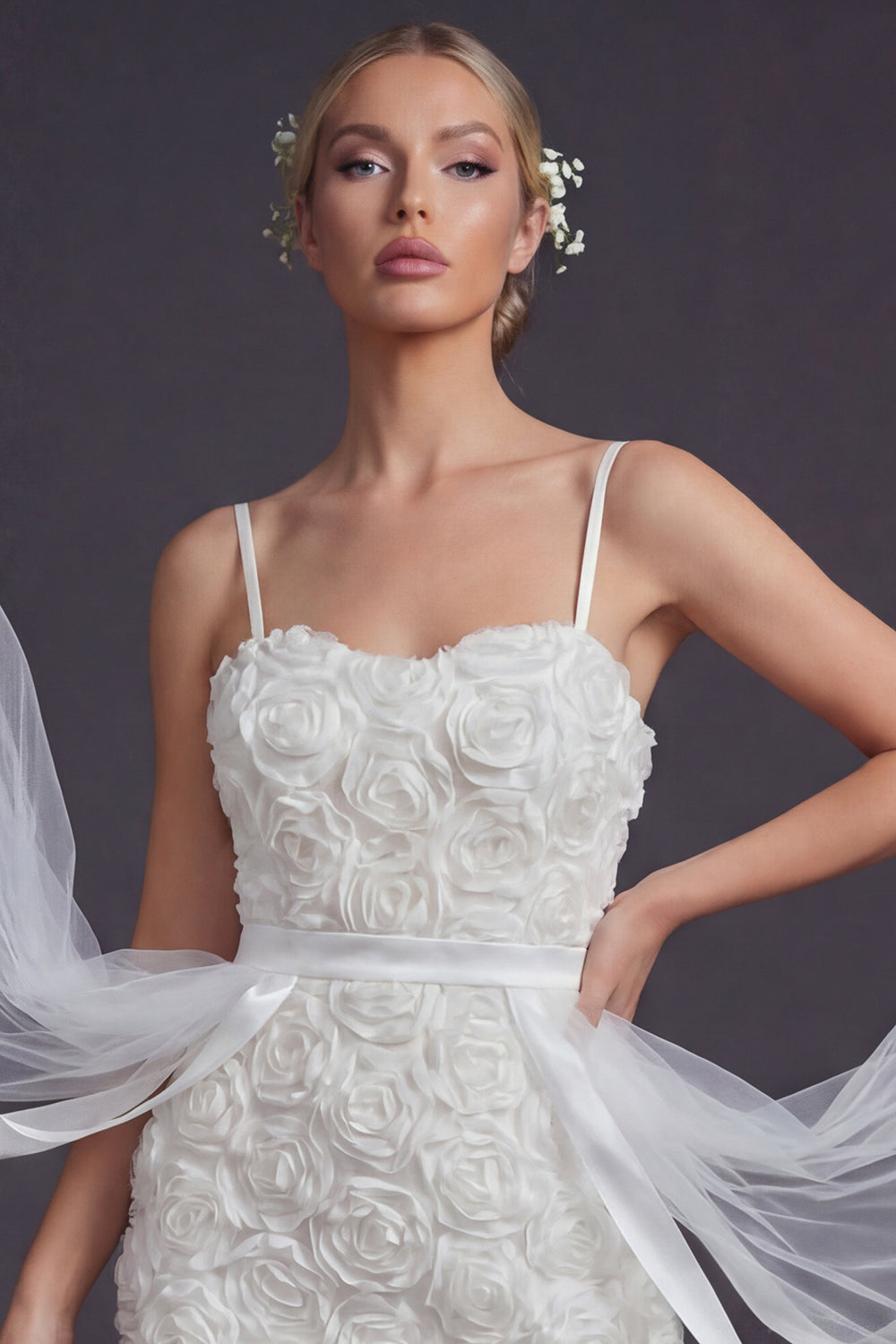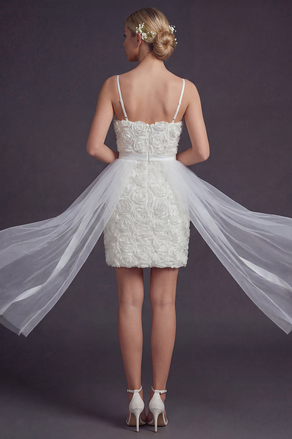 White Bodycon 3D Flowers Spaghetti Straps Short Wedding Dress with Streamer