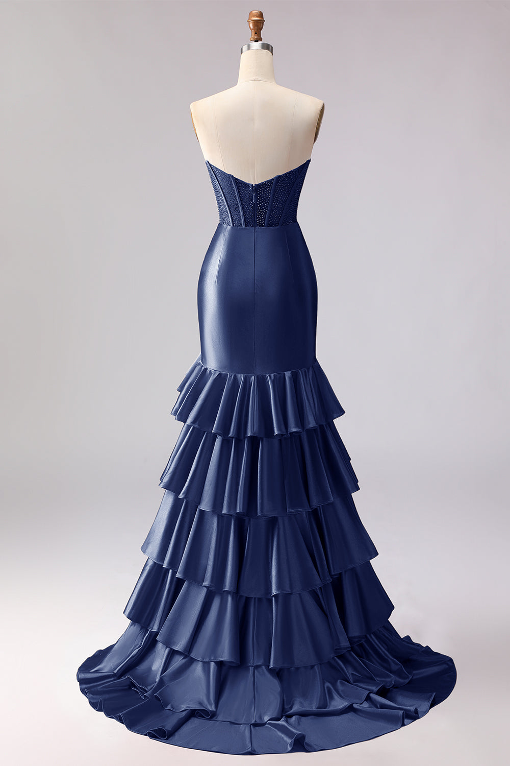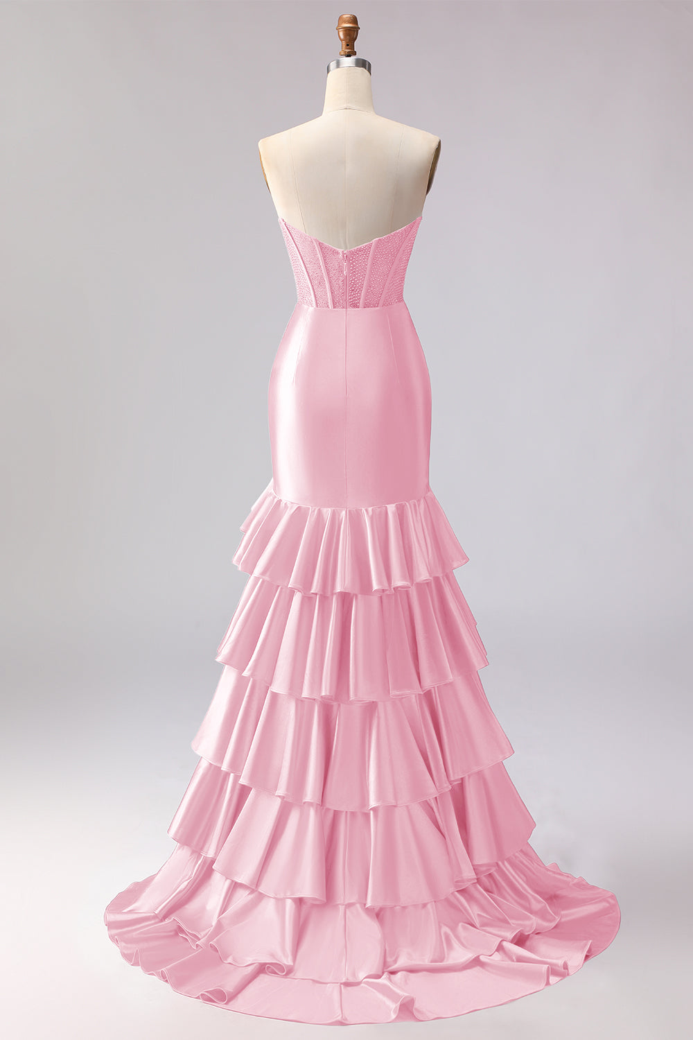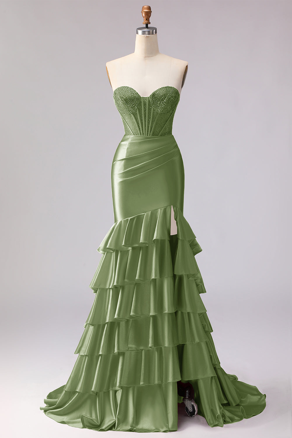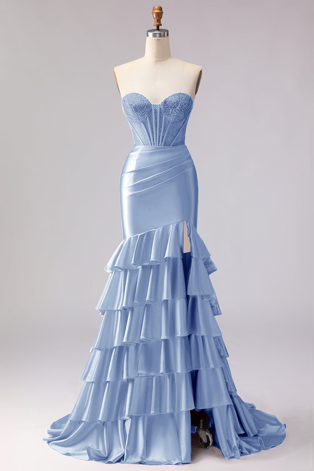 Red Mermaid Sweetheart Beaded Corset Ruffled Long Prom Dress with Slit