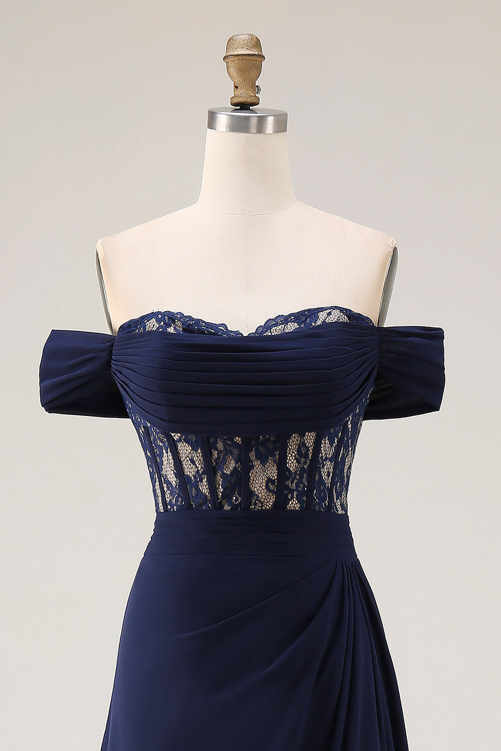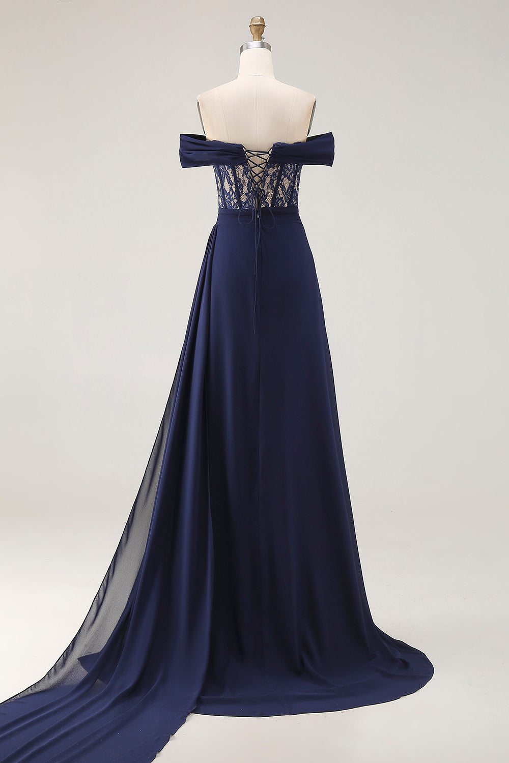 Navy Off The Shoulder A-Line Corset Long Prom Dress with Lace Up Back