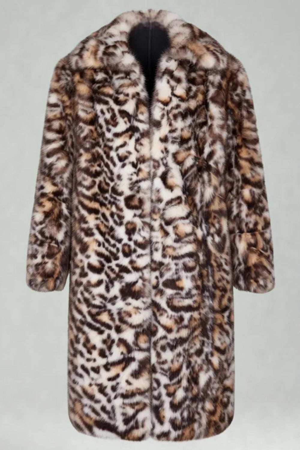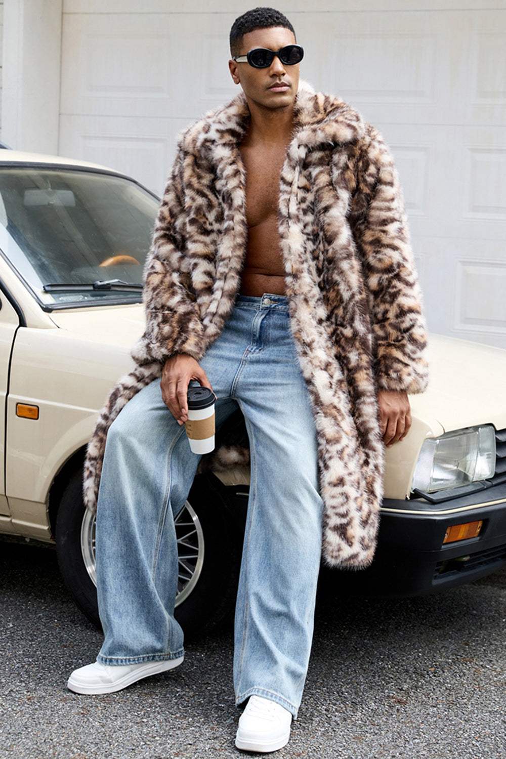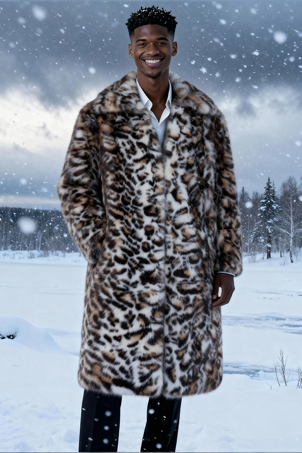 Brown Leopard Faux Fur Open Front Long Men's Coat