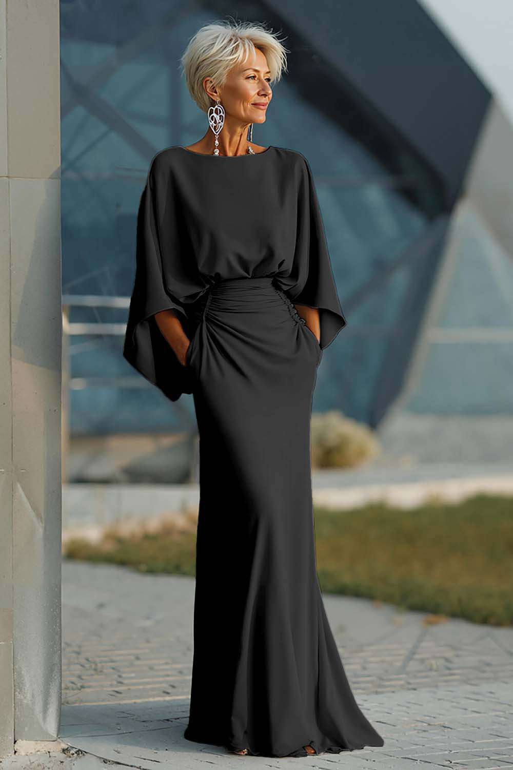 Silver Sheath 3/4 Sleeves Long Mother of the Bride Dress with Pockets