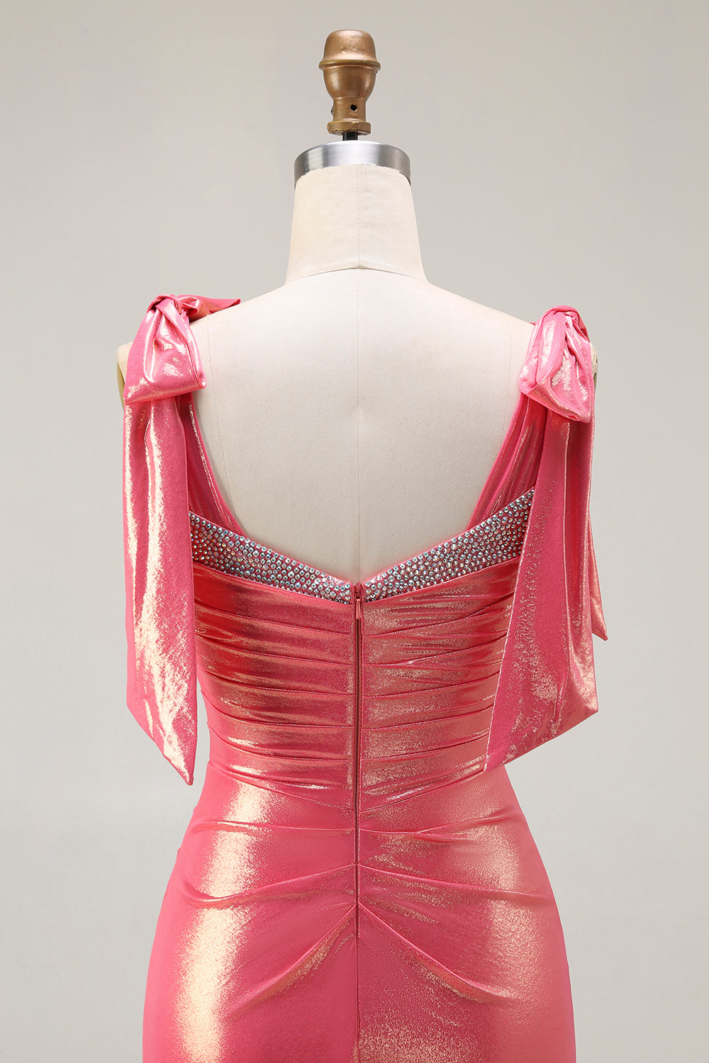 Metallic Coral Beaded Mermaid Ruched Long Prom Dress with Slit