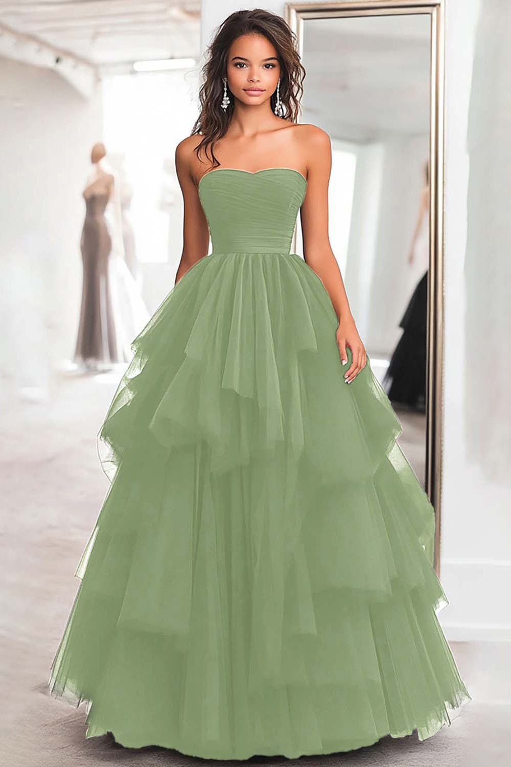 Princess Black Strapless Tulle Tiered Ruched Long Prom Dress