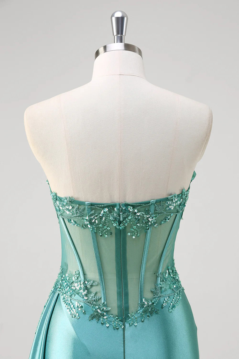 Grey Blue Mermaid Strapless Corset Sequined Satin Prom Dress