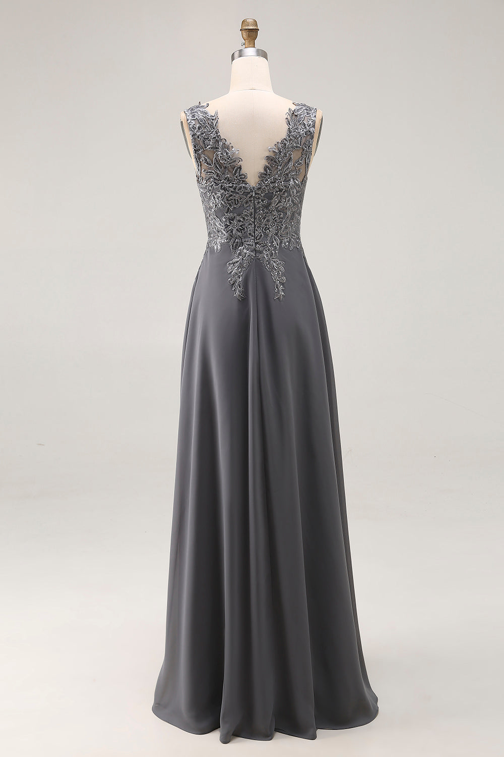 Charcoal A Line V-Neck Lace Applique Mother of the Bride Dress