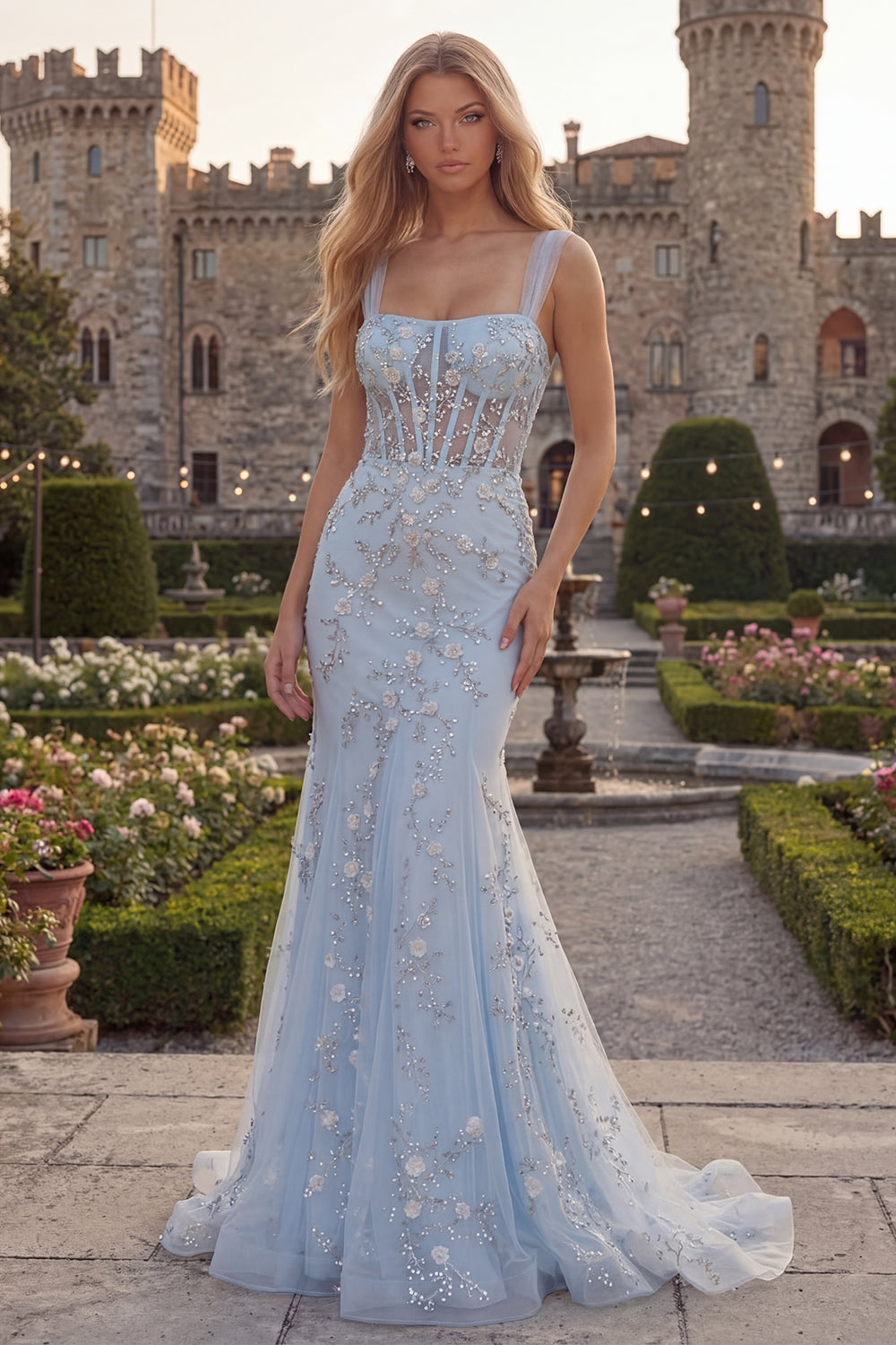 Sparkly Blue Mermaid Spaghetti Straps Appliqued Corset Long Prom Dress with Beading