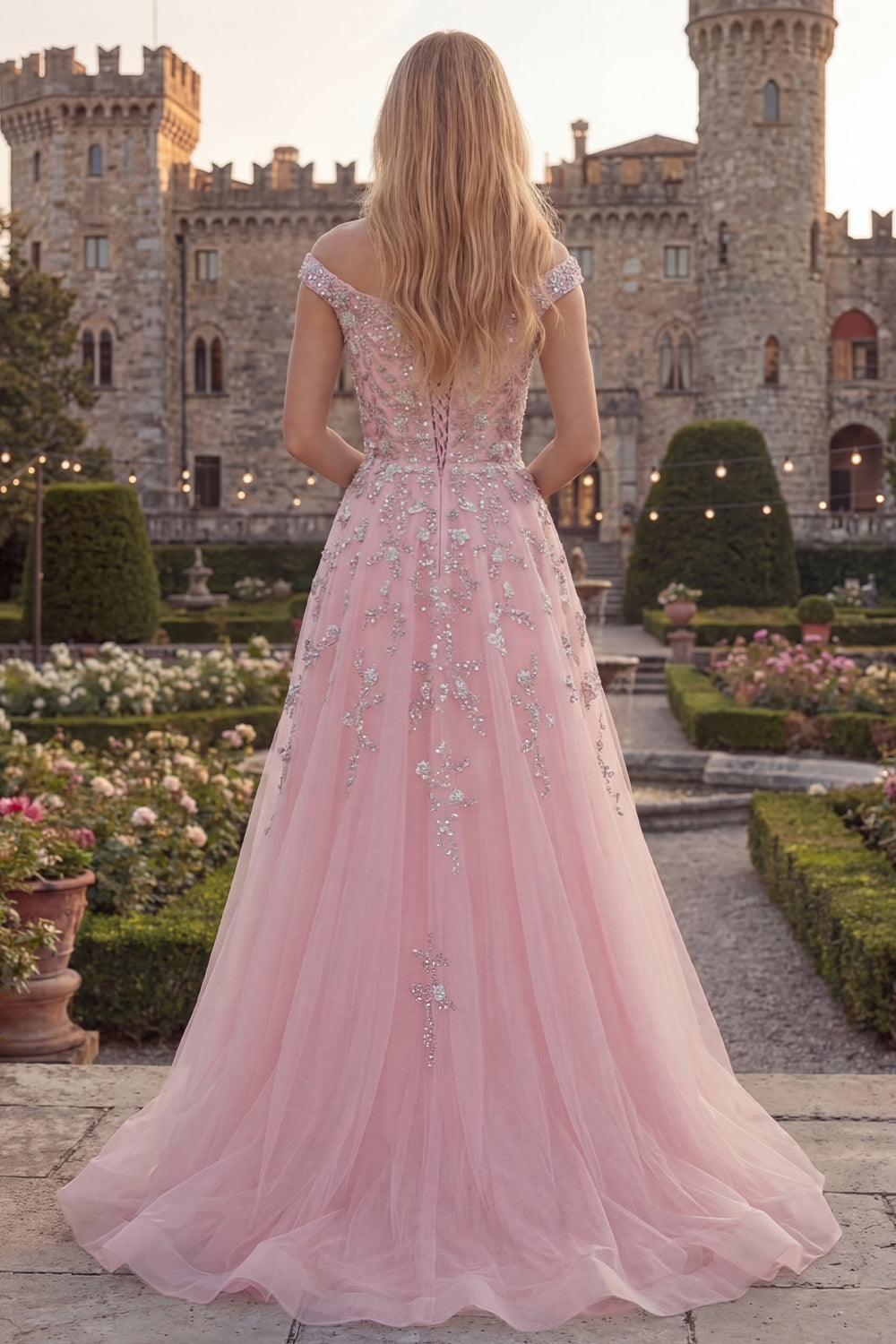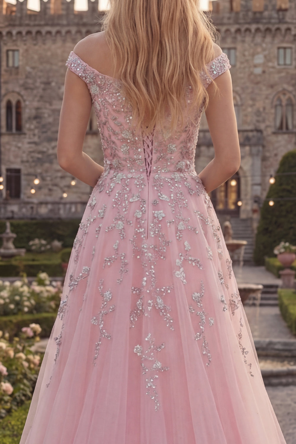 Sparkly Blue Off the Shoulder A-Line Corset Beaded Tulle Long Prom Dress with Appliques