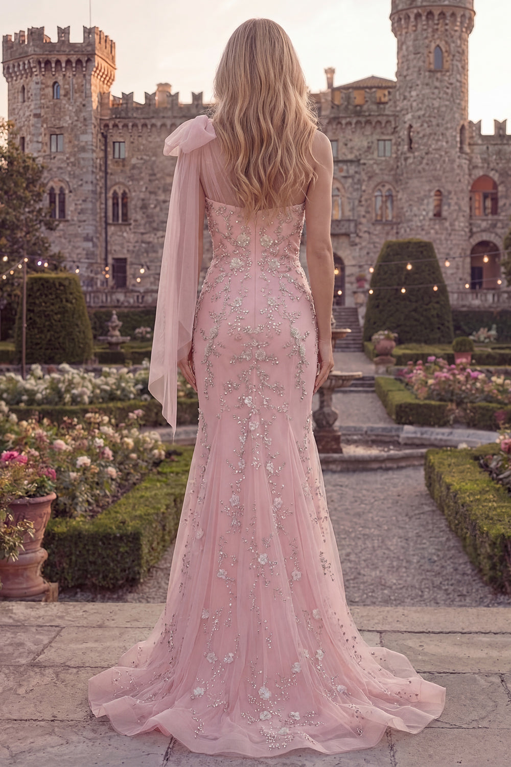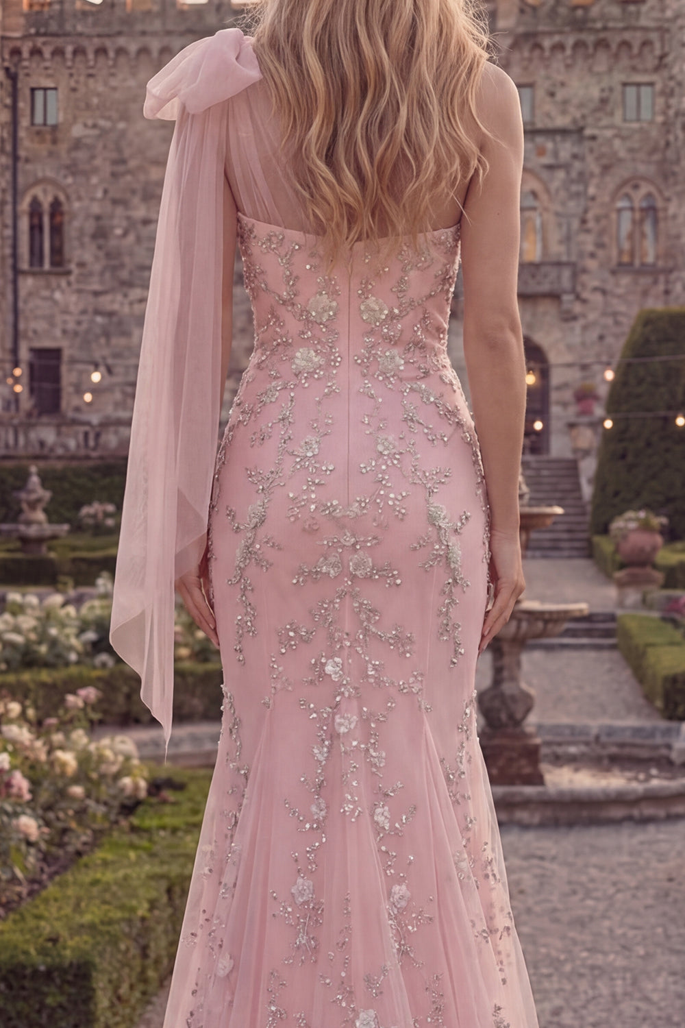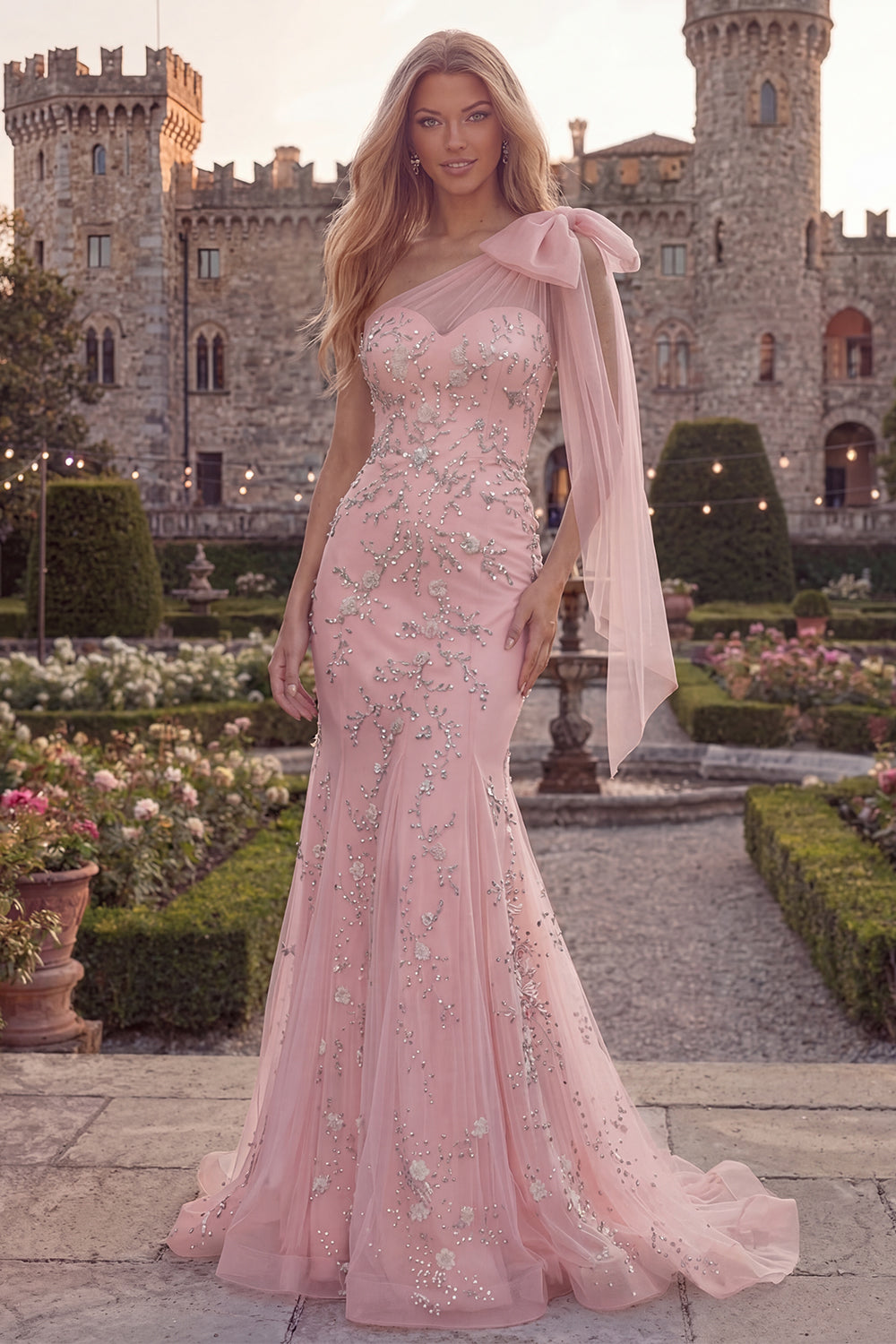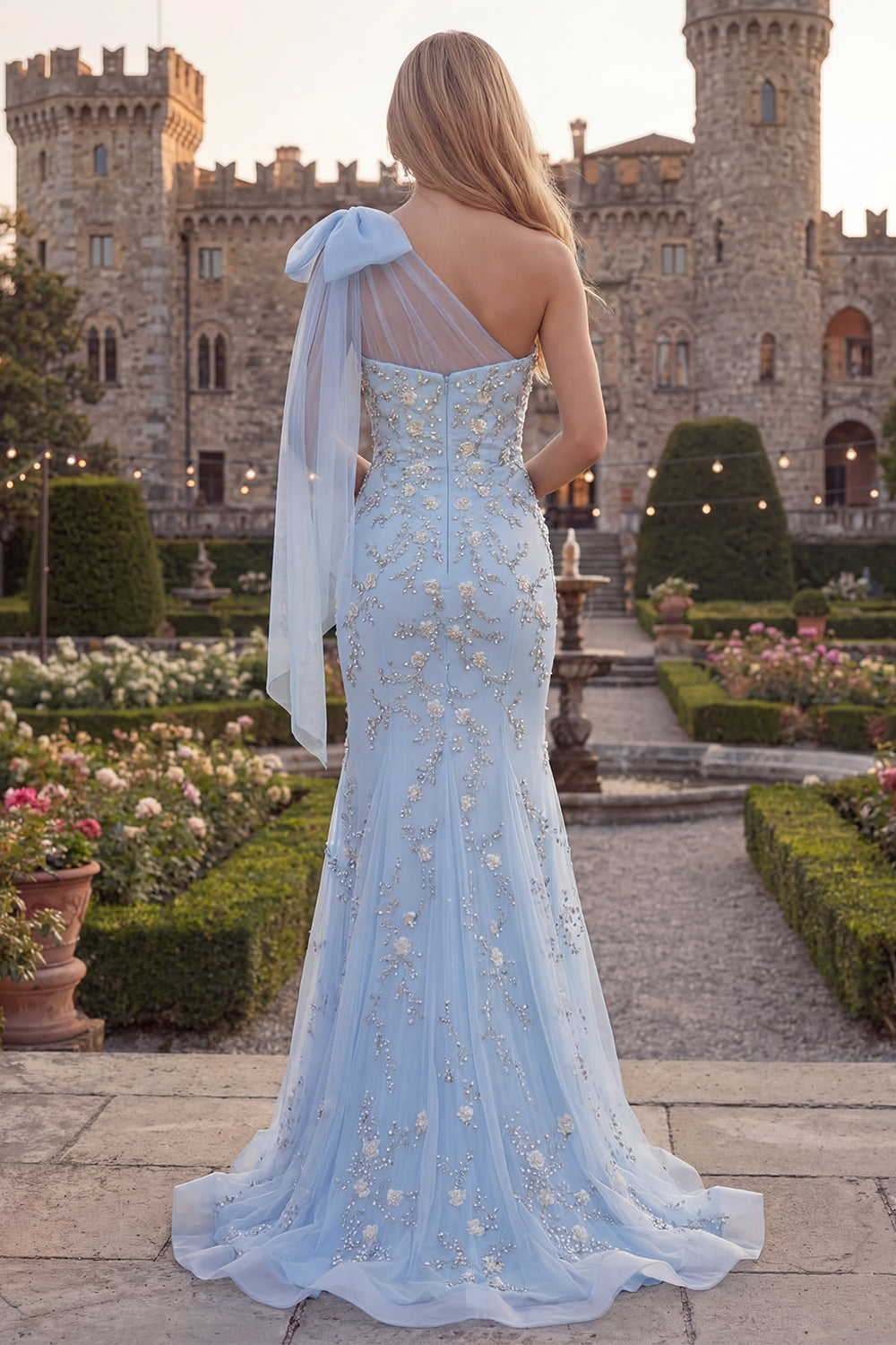 Sparkly Blue One Shoulder Mermaid Appliqued Beaded Tulle Prom Dress with Bow