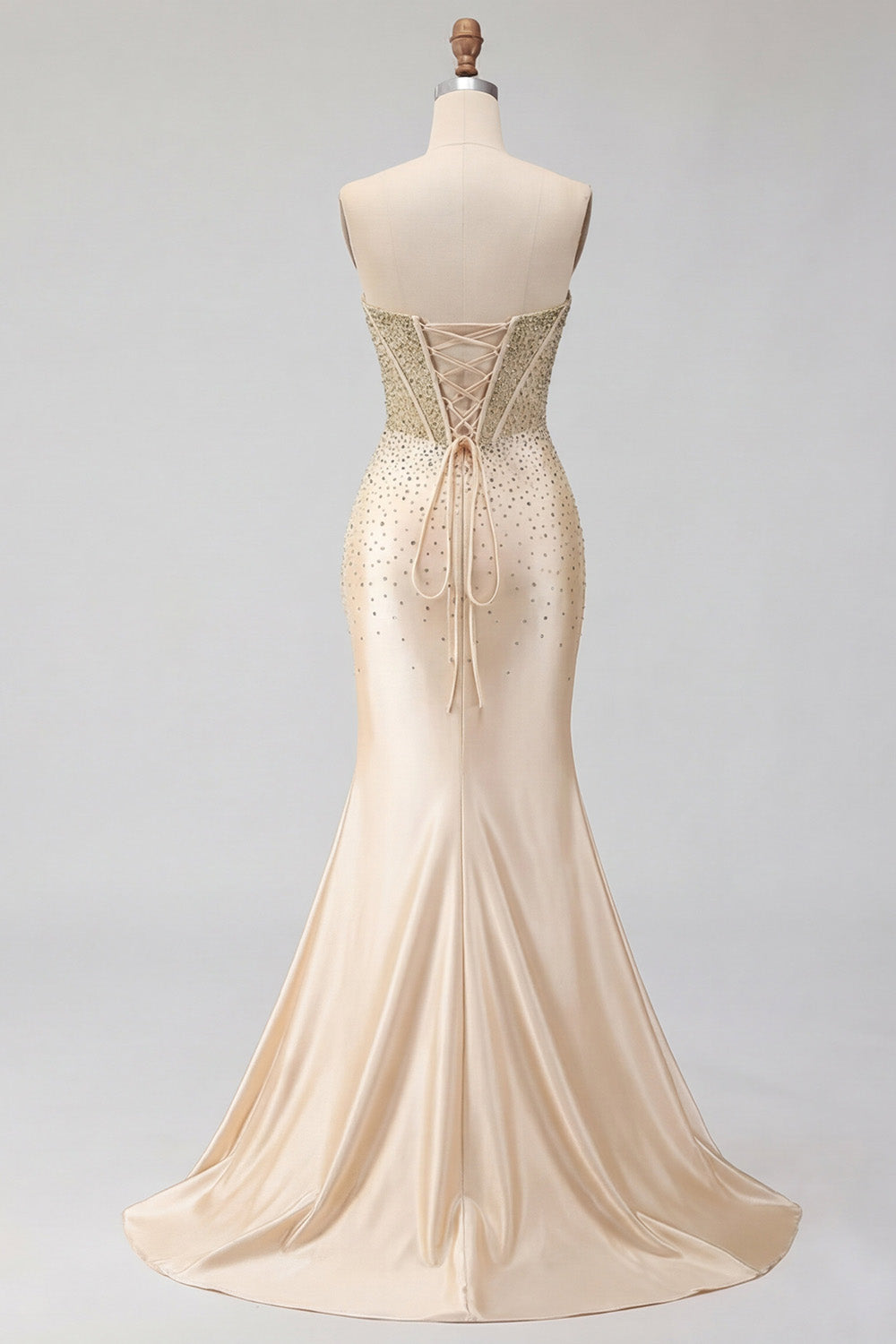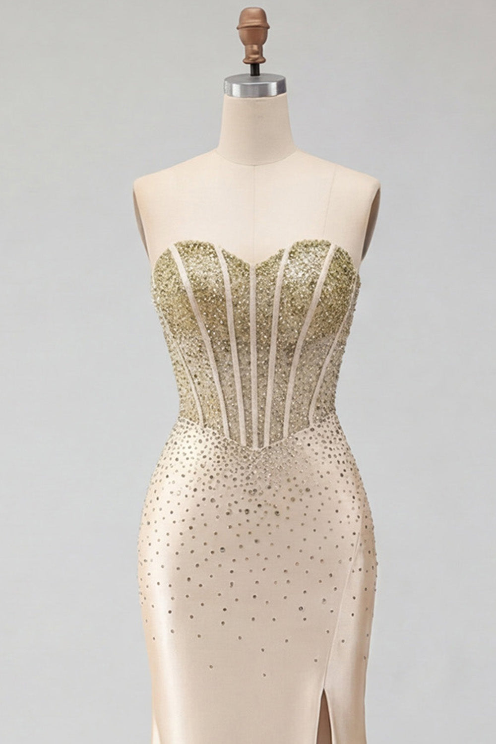 Sweetheart Champagne Beaded Mermaid Corset Long Prom Dress with Slit